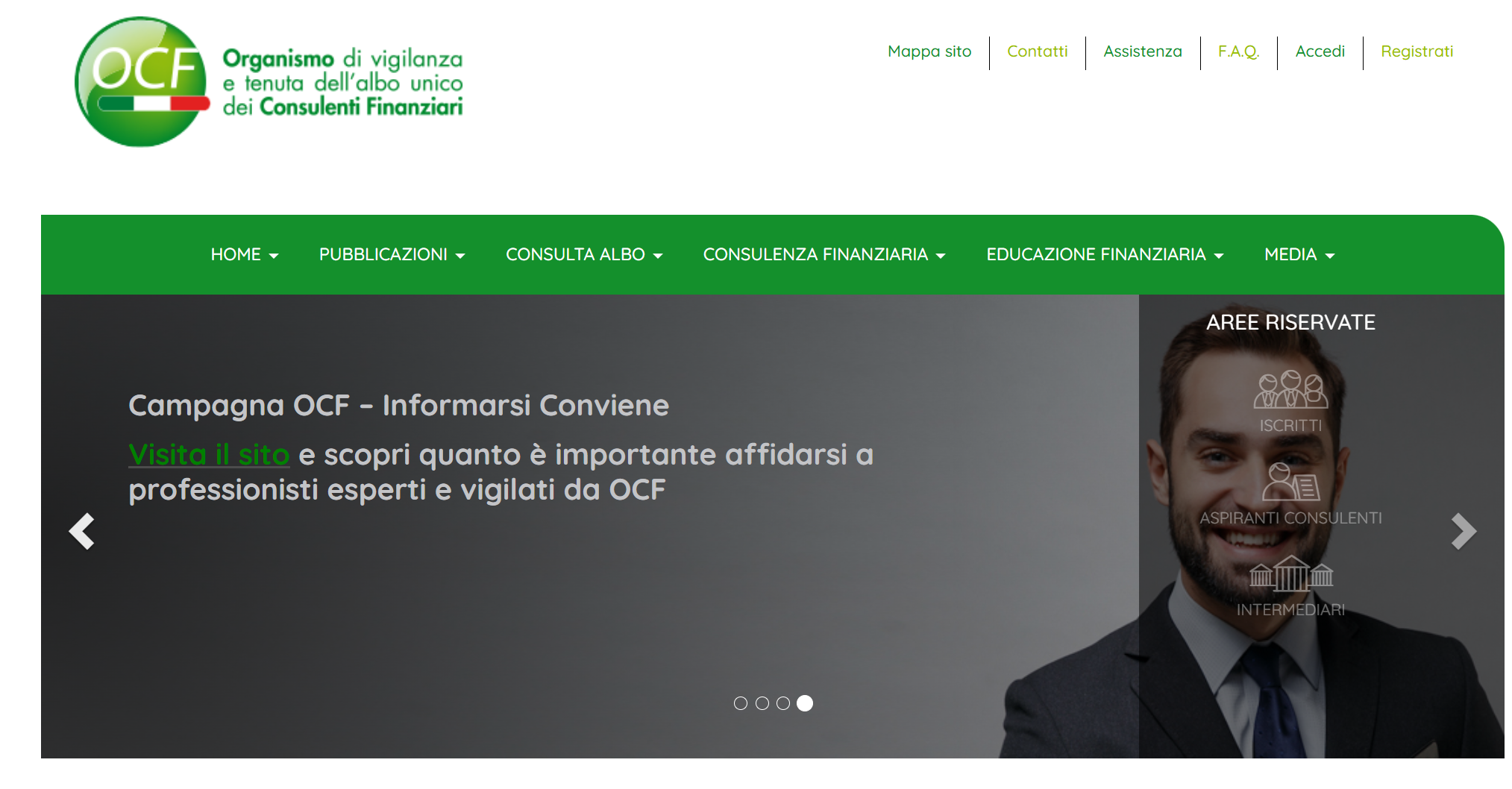Consulente Finanziario iscritto all’albo OCF (Organismo di Vigilanza e tenuta dell’albo unico dei Consulenti Finanziari).